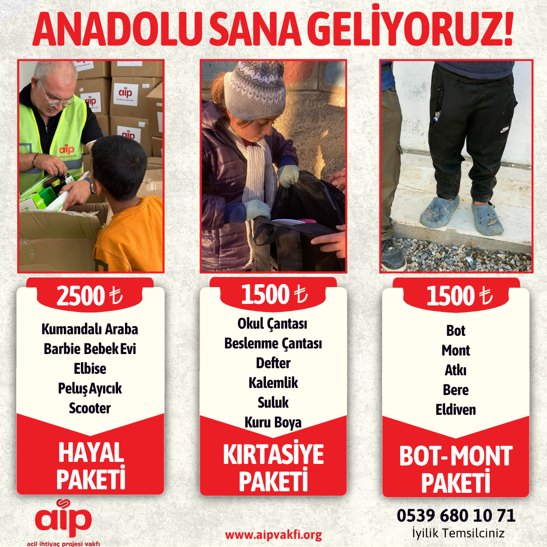 Acil İhtiyaç Projesi Vakfı (AİP), “gıda, eğitim, sağlık, insani yardım ve refah” alanlarında ihtiyaç sahiplerine dokunan, 35 yıllık deneyime sahip bir sivil toplum kuruluşudur. Türkiye’de ve Dünya’da 360 derece yardım anlayışıyla kapsamlı destek verir; kadın ve çocukları önceliklendirir. Farklılıkları zenginlik olarak görüp, toplumsal eşitsizlikleri azaltmaya ve yardımlaşma kültürünü güçlendirmeye yönelik sürdürülebilir çözümler üretir. Topluma fayda sağlayan sosyal sorumluluk projeleriyle, Türkiye'de öncü, dünyada ise örnek gösterilen bir vakıf olma yolunda çalışır.